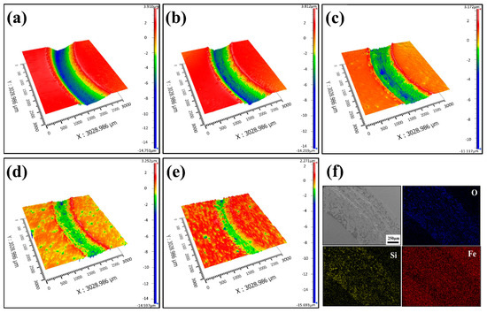 3D wear morphology with different TiC contents: (a) 17-4PH stainless steel; (b) 17-4PH + 3 wt% TiC; (c) 17-4PH + 5 wt% TiC; (d) 17-4PH + 10 wt% TiC; (e) 17-4PH + 15 wt% TiC; (f) EDS analysis of the wear tracks.