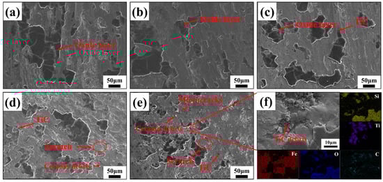 Surface wear morphology with different TiC contents: (a) 17-4PH stainless steel; (b) 17-4PH + 3 wt% TiC; (c) 17-4PH + 5 wt% TiC; (d) 17-4PH + 10 wt% TiC; (e) 17-4PH + 15 wt% TiC; (f) EDS analysis of the wear surfaces.