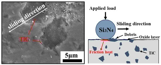 The deformation of the mating surfaces of 10 wt% TiC/17-4PH became shallower relative to 5 wt% TiC. It is clear that the wear resistance of the composites was greatly improved with the increase of TiC content. TiC particles play a crucial role in the wear process, as they impede plastic deformation and shearing force in 17-4PH stainless steel (Figure 15) [47]. However, TiC particles rupture under high Hertzian contact stresses. The spalling of TiC debris generates a new abrasive between the two grinding parts, resulting in significant scratches on the mating surfaces [19,39]. Overall, the main wear mechanisms for 10 wt% TiC/17-4PH were slight abrasive wear and adhesive wear. When the TiC content was increased to 15 wt%, the plastic buildup on the mating surface was significantly reduced, but microcracks and abrasive particles were present on the wear surface (Figure 14e). Microcracks occurred due to the stress concentration caused by the TiC particles in the steel matrix during the wear process, and cracks generated by stress concentration were characteristic of fatigue wear. From Figure 14f, it can be seen that the appearance of abrasive particles was due to the increase in defects caused by TiC aggregation on the surface of the composite. During the high-speed wear process, the TiC particles at the edges of the defects were broken, torn, and detached from the 17-4PH matrix to form abrasive particles [48]. The exfoliated large TiC particles worked together with Si3N4 grinding balls to intensify the degree of wear [49]. Therefore, the improvement of wear resistance was limited with 15 wt% TiC compared to composites with 10wt% TiC added. The main wear mechanisms of 15 wt% TiC/17-4PH composites were abrasive wear, fatigue wear, and adhesive wear.