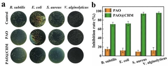 (a) Antibacterial spectrum and (b) antibacterial activity of PAO and PAO@CHM [45].