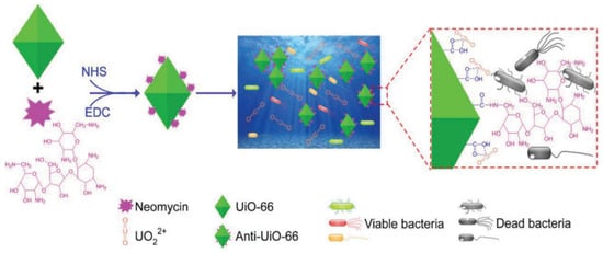 Antibiotic antibacterial materials mainly refer to materials prepared from derivatives of microorganisms, which can be prepared by extraction and chemical synthesis. Neomycin is a widely used aminoglycoside antibiotic that inhibits bacteria by inhibiting protein synthesis or causing bacterial cell membrane collapse. The antibiotic neomycin shows broad-spectrum antibacterial activity against Gram-positive (G+) bacteria, Gram-negative (G−) bacteria, and mycobacteria. Because the biofouling bacteria that predominate in uranium-recovery sorbents are unknown, broad-spectrum antibiotics are the first choice for constructing antibiofouling sorbents for uranium recovery [51]. Yu et al. [52] covalently crosslinked neomycin with the carboxyl group on the MOF adsorbent UiO-66 to obtain Anti-UiO-66, an antibiological pollution uranium adsorbent material (Figure 4). Anti-UiO-66 has broad antimicrobial properties and can inhibit the growth of G+ and G− bacteria. The growth inhibition rate of Anti-UiO-66 on marine bacteria was 87.03%. The uranium absorption of Anti-UiO-66 was 35.74% higher than that of UiO-66 in uranium-supplemented seawater containing 102 CFU/mL bacteria. As the concentration of bacteria increased, which actually occurred in long-term field tests, the uranium-absorption capacity decreased further. In unfiltered 8 ppm uranium-spiked seawater, the uranium-absorption capacity of Anti-UiO-66 was as high as 284.45 ± 4.56 mg/g, which was 16.77% higher than that of UiO-66 at 244.25 ± 5.56 mg/g. After repeated use for five cycles, only an average decrease of 0.9575% in antibacterial activity was observed, indicating that tight covalent crosslinking is more stable for constructing antibiofouling sorbents. Immersed in natural seawater for 30 days, the uranium-absorption capacity of Anti-UiO-66 was 4.62 ± 0.09 mg/g, which was 24.4% higher than that of UiO-66.