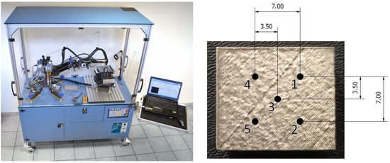 where σ is the residual stress; m is the gradient of the curve, and E (Elastic modulus) and υ (Poisson’s ratio) are the material’s properties. Taking the parameter settings into account, the Mn_K (α) X-ray tube was used, with a collimator of diameter of 1 mm and a Cr filter. The input voltage was equal to 20 kV, and the current was 4 mA. Beta (β) oscillation was 3°, and 15 angle positions were performed on one measurement point (±30°). A penetration depth at these conditions is approximately 10 μm. Each specimen was subjected to 5 measurements, of which 4 measurements were performed in the corners and 1 in the middle of specimens (Figure 2), on their top surface. In the case of all 14 specimens, overall, 70 measurements were carried out.