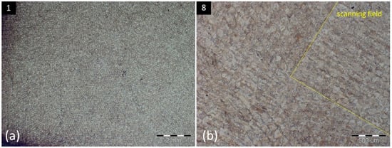 As can be predicted, Figure 4a of specimen 0 resembles the typical microstructure of conventionally made AISI 316L stainless steel, with austenitic equixially variously oriented grains in sizes from 10 to 100 μm. In comparison, the microstructure of specimen 1 is typical for the material made by 3D printing, using the Selective Laser Melting process, which includes irregular grains (sizes from 20 to 50 μm) with various orientations. It can be ascribed to the influence of laser energy, rapid cooling, and bonding of the individual layers within the selected scanning strategy during the printing process. Characteristic indicators are elongated grains in the direction of scan traces, resembling the sloping lines, as shown in Figure 4b. The orientation of the mentioned scan traces is dependent on the rotation angle of each field within the Chessboard scanning strategy. Interfaces of these fields can be seen in specimens 1 (Figure 5a) or 8 (Figure 5b).