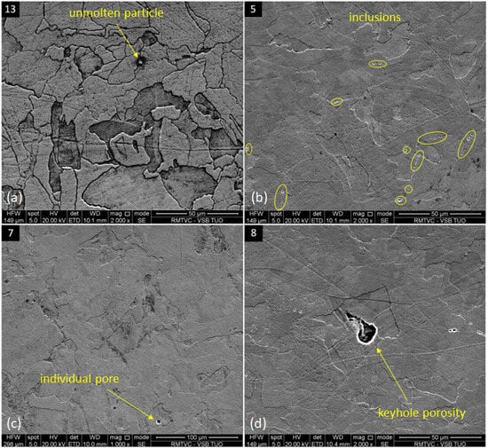 Discontinuities in specimens: (a)—unmolten particle—13; (b)—inclusions—5; (c)—individual pore—7; and (d)—keyhole porosity—8.