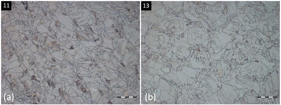 Heat treatment caused some variations within the microstructure of evaluated specimens. No significant differences were found in the case of the 650 °C temperature regime; however, the first changes occurred already at 700 °C, where the markedness of scan traces was reduced with the increasing of applied temperature. Furthermore, with the temperature rising, austenitic grain boundaries are more significant, which can be the partial consequence of graduating inclusion precipitation in these areas, and the etching process plays its role, too. At 750 °C (specimen 11—Figure 9a) and 800 °C (specimen 13—Figure 9b), further grain growth is present, mainly in the case of the second-mentioned specimen, reaching sizes of up to 100 μm.