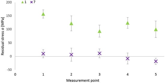 According to diffraction resulting data, the most neutral stress state after the stress relaxation heat treatment process was reached during the processing of specimen 7, specifically, at a 700 °C temperature regime of an 8-hour holding. The resulting average residual stress is 0.4 MPa, with a maximum (tensile) stress at point 3 equal to 11.3 MPa, minimum (compressive) stress at point 5 equal to −18.1 MPa, and the most neutral value (6.4 MPa) at point 2. Figure 10 includes a comparison of specimen 1 and specimen 7. It compares the magnitude of residual stresses in every single point of the measurement (see Figure 2) within both specimens. The measured values of specimen 7 are situated around the central horizontal line, corresponding to the neutral residual stress state. Taking the measurement variance into account, it is quite similar for all measurements and both specimens. A variance, or a statistical error, refers to the uniformity of stress distribution in the evaluated point. The lower the value of this variance (also relative to the normal stress value), the more homogenous the material and the more the stress uniformity. The highest variance was reached in the case of point 5 (±30.8) in specimen 1, and the lowest was reached at point 5 (±11.5) in specimen 7. Such values of the variance were reached during all 70 measurements of specimens. If the whole area (comparison of all five points) is the point of interest, higher deviations are reached in specimen 1. The difference between the maximum (Max. = 157.5 MPa) and minimum (Min. = 93.7 MPa) values is 63.8 MPa, whereas in specimen 7, this difference is 29.4 MPa (Max. = 11.3; Min. = −18.1). This confirms the fact that the heat treatment caused a neutral residual stress state in specimen 7 and also caused a more balanced stress state between all five measurement points, which is proof of reaching the stable stress state within the mentioned heat-treated specimen. Also, it can be stated that the number of measuring points within one specimen needs to be adapted to its size based on various residual stress values between all points.