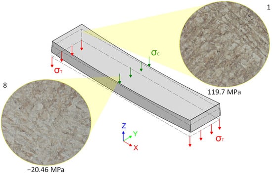 A comparison of residual stresses between specimens 1 and 8 is also worth mentioning, despite the fact that both specimens were not heat-treated and their microstructures were identical. It can be expected that these two specimens should include the same or at least similar stress states. The bending phenomenon, occurring in the case of longer specimens, was described in the research performed by Liu, Yang, and Wang [24], which pointed to its impact on the shape and deformation of the component. Similar bending of an original part after the removal of a substrate and its impact on the residual stress distribution need to be considered. It occurs as the consequence of parts dimensions, specifically, the ratio between the length of edges in the x and y axes, in combination with a quite small thickness, despite using the support structures. The part is under the influence of tensile strain before it is removed from the platform. Right after the removal process, these strains are relaxed, which leads to the bending under a certain angle of the part. During this process, the top surface layer is compressed in its middle area, which consequently leads to the induction of compressive residual stresses. On the opposite bottom surface, the part is stretched, which leads to the lifting of both sides on the longer (x) axis in a z-axis direction. The consequence is resulting in tensile residual stress on both sides. Such a residual stress distribution within the original part is plotted in Figure 11. Taking a diffraction resulting data into account, this phenomenon is confirmed. In specimen 1, from the left side of a part, the average residual stress is equal to 119.7 MPa, whereas in specimen 8, from the middle of the part, the average residual stress is equal to −20.46 MPa. It makes a difference in residual stress between these specimens and also between the middle and left sides of the part, equal to 140.16 MPa.