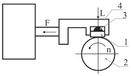Principle of operation of T-05 roller-block tester: 1—block, 2—roller, 3—insert, 4—sample holder, F-friction force, L-load, n- rotation speed.