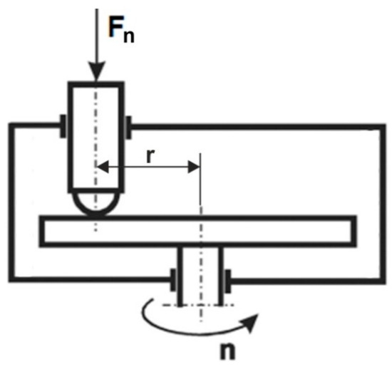 The CoF and the wear index were determined in accordance with the ISO 20808 standard. For this purpose, a T-21 ball-on-disc tribotester ((Łukasiewicz Research Network—Institute for Sustainable Technologies, Radom, Poland) designed to study the tribological properties of cooperating materials during sliding friction was used. The scheme of the T-21 ball-and-disc tribotester is shown in Figure 3. It consists of a rotating disc (sample) and a statically fixed countersample in the form of a pin with a spherical tip made of Al3O4. The pin is loaded with the force F.