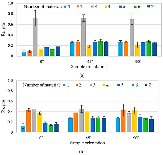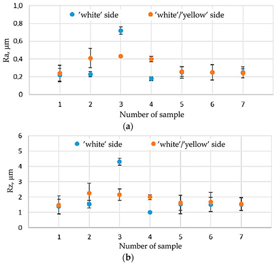 Average values of roughness parameters for the tested samples: (a) Ra, (b) Rz.