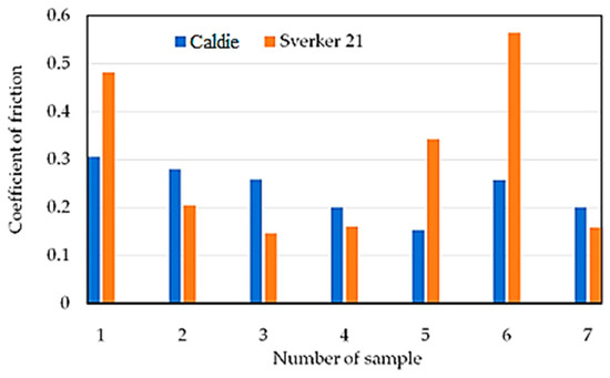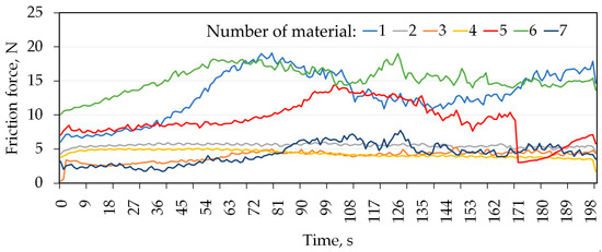 Table 4 shows the mass loss of the materials under a load of 20 N. In addition, the results of mass loss and average CoF are shown graphically in Figure 7 and Figure 8, respectively. Analysing the presented results, for most of the tested sheets (samples 1–6), smaller mass losses were clearly recorded for the countersample of Caldie steel. Samples 1 and 5 without a varnish coating and sample 4 with a varnish coating are characterised by the lowest wear. The greatest difference in the CoF, approximately 50%, when testing with analysed countersamples, was observed for samples no. 5 and 6 (Figure 9). In turn, the smallest difference in the value of the CoF was observed for samples no. 4 and 7. Figure 9 and Figure 10 show the variation of the friction force during friction testing. In the case of Caldie steel countersample the friction force is at the most stable level and reaches the lowest values for sample 4. On the other hand, the highest CoF occurs in the case of contact of samples no. 1 and 6 with the countersample made of Sverker 21 steel. Test results with the Sverker 21 steel countersample (Figure 10) appear to show a more stable friction process compared with the Caldie steel countersample (Figure 9). For most of the samples (no. 2, 3, 4 and 7), the value of the friction force varies slightly throughout the test period and is much lower than for the as-received sheet metal (sample no. 1). No clear relationship was observed between the surface roughness of the samples and the course of the friction process.