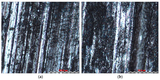 By analysing the friction surfaces shown in Figure 11, Figure 12, Figure 13 and Figure 14, it can be concluded that the typical wear mechanism in these materials is abrasive wear, with scratching and ploughing identified. Locally, adhesive wear and the accumulation of wear products in the form of sticker patches are also observed (Figure 11b). For sample 1, the Sverker 21 counterexample results in the accumulation of more wear products on the surface, which consist of oxides chipped from the surface. The main differences for samples 2 and 3 can be identified in terms of the depth of the scratches and grooves on the surfaces after friction (Figure 12 and Figure 13); deeper grooves were observed after using the counterexample made of Caldie steel. After using a counterexample made of Sverker 21 steel, the surfaces of the samples are ‘smoother’ and wear products adhering to the surface are also observed. Sample no. 4, for which the friction surfaces are summarised in Figure 14, differs from those presented in Figure 11, Figure 12 and Figure 13. In addition to the scratches, areas that are locally deformed are visible. This may be related to the disruption and overspray of the painted layer. This phenomenon is more pronounced for countersamples made of Caldie steel. Similar wear mechanisms after analysing the surfaces of the specimens were observed for unpainted specimens no. 5–7, where the dominant wear mechanism was abrasion of the sheet surface through scratching and grooving.