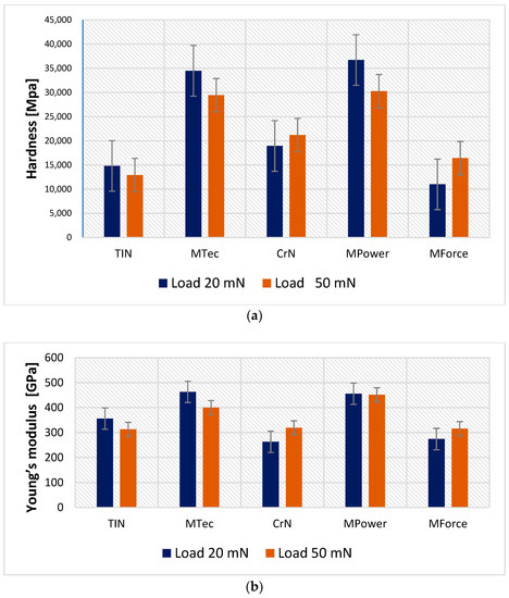 Coatings with high hardness and low modulus of elasticity can carry a significant load that does not plasticise the coating [14]. Ensuring both high hardness and hardness to Young’s modulus ratio with adequate substrate stiffness is particularly important for thin coatings; however, in their tribological applications, the value of the CoF should also be considered.