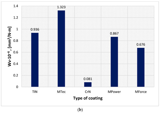 Figure 17 presents a summary of the average values of the CoF of the analysed coatings. The highest value of the average CoF was observed for samples coated with CVD-TiN and MTec coatings. The most favourable friction conditions are provided by the CrN coating, for which the value of the CoF is about 36% lower than that of the CVD-TiN coating. The low CoF of the CrN coating is also associated with the smallest coefficient of volumetric wear of the sample (Figure 18a) and countersample (Figure 18b).