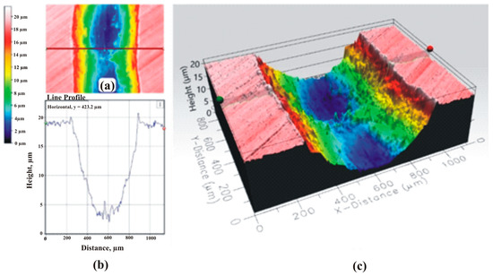 Topography of wear track (top view) (a), profile of friction track and (b) topography of friction track (isometric view) (c) for CVD-TiN sample.