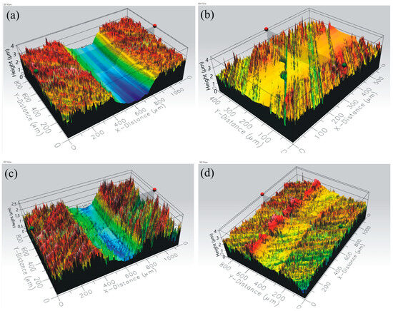 Three-dimensional topographies of friction track for samples coated with the following: (a) MTec, (b) CrN (c) Mpower, (d) Mforce.