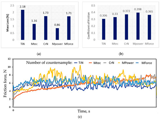 Tribological tests were carried out using countersamples with as-received surfaces. The highest mass loss (2.18%) was observed for the countersample with the MTec coating. The countersamples coated with MForce and CrN coatings turned out to be the most wear resistant (Figure 21a). Despite the lowest mass loss, the CrN-coated countersample showed the highest CoF value, µ = 0.398 (Figure 21b). Among all the coatings tested, the difference in the CoF value is less than 10%. Despite fluctuations in the friction force, the countersamples coated with MTec, MPower Nano, CrN and MPower exhibited a stable average friction force throughout the test. Only the MForce-coated countersample showed a continuous increase in the friction force over the entire test period. This may indicate premature rupture of the coating and intensification of the wear processes. On the other hand, the value of the friction force during the test with this countersample was the most stable without large fluctuations.
