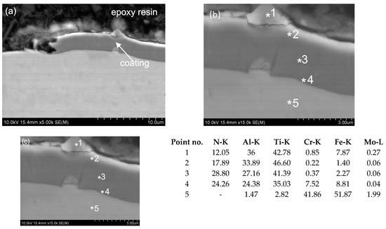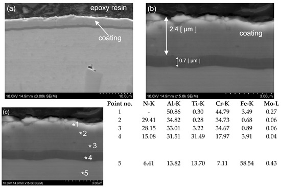 Microstructure of the CrN coating and substrate (SEM) (a), thickness of coating (b), chemical composition (wt. %) of the CrN coating and the substrate (EDS-SEM) (c).