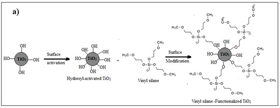 In the second step, 1.5 g of the previously activated nanoparticles were sonicated in 30 mL of toluene in an Elmasonic sonicator water bath for 30 min, and the mixture’s temperature was maintained at 70 °C during the sonication. The solution was then subjected to mechanical stirring for 2 h at 70 °C and 500 rpm. Then, a 10% weight fraction vinyl silane solution in toluene was gradually added, and the mixture was stirred for 8 h at the same temperature. For further characterization and utilization of the functionalized TiO2, it was collected, cleaned with isopropyl alcohol, and then dried at 120 °C for 24 h in a vacuum oven, as illustrated in Figure 1a.