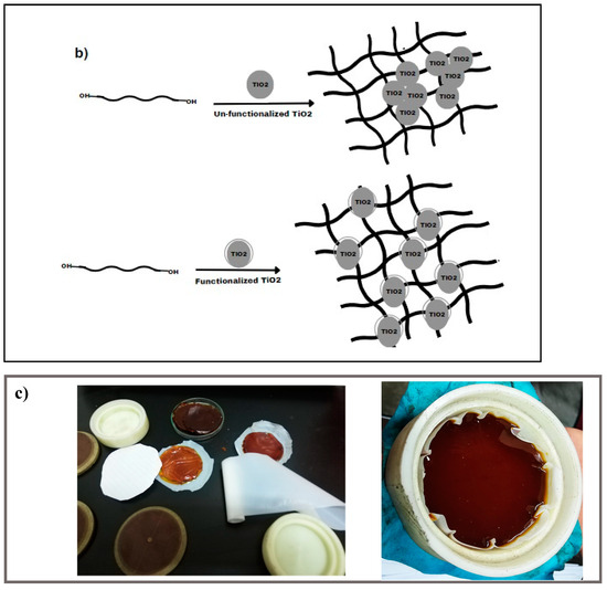 In another vessel, a suitable amount of TiO2 nanopowder (functionalized or un-functionalized) was mixed in a suitable amount of a thinner and sonicated at 30 °C for 30 min. By the end of sonication time, the suspended nanoparticles were added to the previously prepared varnish/thinner mixture, and the entire mixture was vigorously stirred. To prevent air bubbles and voids, the mixture was defoamed for a few seconds at a speed of 1200 rpm after being violently mixed for 5 min at a speed of 1500 rpm in the planetary centrifuge mixer. The combination was then subjected to 75 min of sonication in an Elmasonic sonicator at around 50 °C to promote optimal dispersion of the nanoparticles within the varnish and to enhance the homogeneity of the obtained nanocomposites. The resulting mixture was then cast into a non-stick Teflon dish to avoid adhesion and kept at room temperature for 2 h before being annealed under vacuum at 130 °C for 8 h to accelerate the solvent evaporation. As the used varnish is a thermoset polymer type, the samples get stronger after curing due to the devolving of chemical linkages created between their components, as seen in Figure 1b.