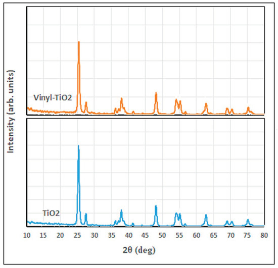 Figure 3 shows the XRD diffractogram of unfunctionalized and functionalized TiO2. As shown in this figure, both tested samples show a well-known reflection pattern for the anatase crystalline phase: (101), (004), (200), (105), (211), (204), (116), (220), (215), located respectively at 2θ of 25.3, 37.6, 47.8, 53.7, 54.8, 62.6, 68.7, 70.2, and 75.0°, while the small peak appeared at 27.1° characteristic for the rutile (110) phase [7,38,39]. These peaks confirm the presence of the corresponding crystalline phases of TiO2 in the sample; however, the modification of TiO2 nanoparticles has not significantly altered the crystallography of the vinyl-silane modified-TiO2 structure except for the appearance of the peaks located at 2θ of 41.2 and 56.5° for vinyl-TiO2.