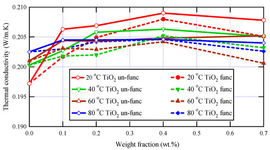 Regarding the effect of the functionalization of nanoparticles on the thermal conductivity of nanocomposites, it is observed in Figure 5 that the thermal conductivities of nanocomposites containing un-functionalized nanoparticles have greater values than those in the case of functionalized nanoparticles, and this was clear at all temperatures and for all nanoparticle loadings. These observations may be attributed to the great interfacial surfaces of functionalized TiO2 nanoparticles, which create higher levels of phonon scattering where heat propagates extremely slowly, which in turn decreases the thermal conductivity of the tested nanocomposites. Furthermore, the higher values of thermal conductivity in the case of un-functionalized nanocomposites over the functionalized ones can be attributed to a greater number of agglomerates, which act as rapid heat conduction zones. This tendency is influenced by the aggregation of fillers and the filler-matrix interfacial thermal resistance.