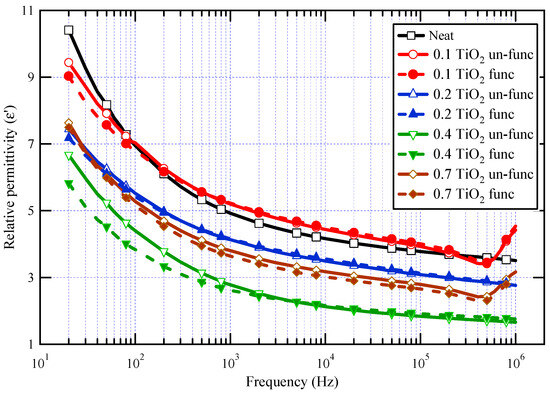 The real component of the complex permittivity (ε′) for neat varnish as well as varnish/TiO2 nanocomposites samples is demonstrated in Figure 6. For all samples, it is demonstrated that as frequency increases, ε′ decreases. This behavior is expected for dielectric materials because the contribution of orientation polarization decreases as frequency increases [16,17,18,19,55,56]. The real value of dielectric permittivity is proportional to the number of oriented dipoles present in the tested material and their capacity to undergo orientation at the applied frequency. When the frequency rises, there will not be sufficient time for dipoles to follow the applied field and contribute to the orientation polarization, resulting in a decrease in ε′ rates [57,58,59]. However, the irregular increase in relative permittivity values in the megahertz range is attributed to the possible resonance effects resulting from insufficient contact in the measuring cell [60,61].