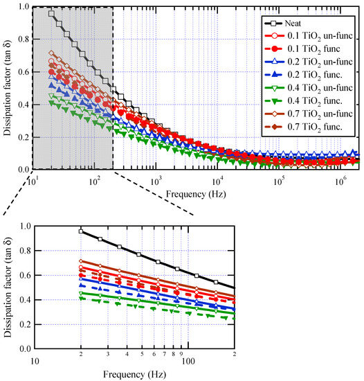 Figure 7 represents the dissipation factor (tan δ) as a function of frequency at different weight fractions with and without surface functionalization. It is clear that there is a drop in tan δ values against frequency for all samples, likely due to a reduction in electrical conductivity in varnish nanocomposites with increasing frequency, which is brought on by charge carriers’ inability to pass through the thickness of the material at higher frequencies. There is an obvious reduction in tan δ values for all weight fractions when compared to base varnish material, especially at lower frequencies. With increasing the loading of TiO2 nanofillers in the base material, tan δ reduced up to 0.4 wt.% filler concentration, above which tan δ began to increase again at 0.7 wt.% filler concentration. For all weight fractions of nanoparticles, it is evident that the tan δ values of functionalized TiO2 nanoparticles are lower than those of un-functionalized ones.