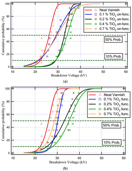 Figure 8 demonstrates the Weibull cumulative probability versus breakdown voltage for various neat varnish and varnish/TiO2 nanocomposite samples. Furthermore, Table 2 depicts the values of BDV with AC supply at 50% probability and BDV at 10% probability for all varnish samples. Where the BDV values at 50% probability indicate the average value of BDV, and the minimum possible breakdown voltage happens at 10% probability of the BDV value.