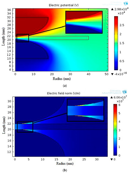 Distributions of (a) potential and (b) electrostatic field around mushroom-to-mushroom electrode for the varnish/0.4 wt.% TiO2 nanocomposite.