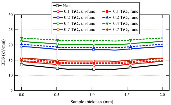 It is significant to note that for almost all synthesized samples, varnish/functionalized nanoparticles have higher BDS values than varnish/un-functionalized nanoparticles when concentrating on the influence of functionalization on breakdown strength. This is due to the high interfacial area between the nanoparticles and the polymer matrix in functionalized samples and the excellent nanoparticle dispersion within the matrix. Another finding is that when the doping filler percent of TiO2 increases, the breakdown strength of nanocomposite samples increases first and subsequently decreases. The breakdown strength of the nanocomposite achieves its greatest value when the loading percent is 0.4 wt.% of functionalized nanoparticles. These findings are attributed to the interaction between base polymer chains and nanoparticles, resulting in a tiny interfacial layer around the nanoparticle. This layer is divided into two sections: a loose polymer area and a tightly bound region with restricted mobility [66].