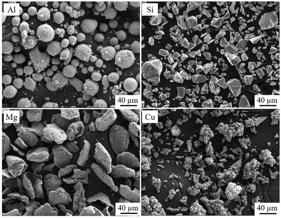 SEM micromorphology of Al, Si, Mg, and Cu powder particles.