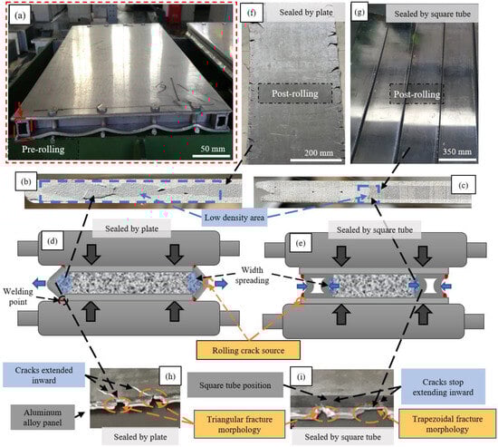 Cavity design and optimization mechanism. (a) Pre-rolling preforms sealed by square tubes; (b,c) Cross-sectional structure of post-rolled preforms sealed by plates/square tubes; (d,e) Deformation behavior of preforms sealed by plates/square tubes during rolling; (f,g)Overall appearance of post-rolling preforms sealed by plates/square tubes; (h,i) Edge crack characteristics in preforms sealed by plates/square tubes.
