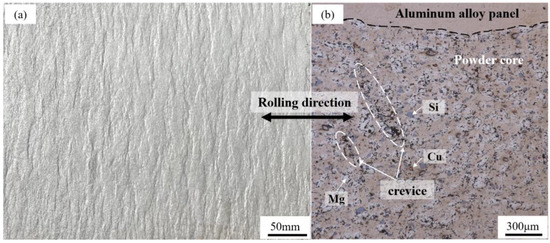 where M is powder filling mass, V is mold cavity volume, H is initial precursor thickness, h is precursor thickness after cold rolling, and ρ is average mixed powder particle density. Experimental results indicate that the powder’s relative density (d) after cold rolling approximates 85% (2.4 g/cm3), implying around 15% compressible space within the core layer. Continued cold rolling, however, can lead to a macroscopic wavy composite interface morphology between the panel and powder core along the rolling direction (Figure 4a), marked by weak bonding and susceptibility to stripping. Microscopically, the powder particles exhibit weak bonding capability, with observed cracks in the powder core, as shown in Figure 4b.