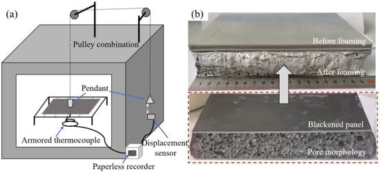Foaming experiments were carried out using a custom-designed apparatus capable of real-time monitoring of time, temperature, and expansion ratio during the precursor foaming process, as illustrated in Figure 5a. Its height-measuring device consisted of pulley blocks, asbestos wire, pendants, and a high-precision infrared displacement sensor, which achieved a low measurement error of repetition accuracy within ±35 μm. In Figure 5b, we showcase the precursor both before and after foaming. It is worth noting that the precursor’s panel underwent a blackening treatment to enhance its absorption of infrared radiation energy within the furnace, thus enabling rapid heating. This treatment contributed to the achievement of an excellent pore structure, as demonstrated. The expansion rate is calculated using the following formula:
