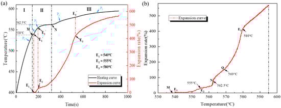 Figure 6b depicts the expansion rate and real-time temperature relationship. Notably, the expansion rate exhibits a minimum at E2 and a maximum at N. The expansion process reveals three increasing intervals, E1 to E2, E2 to N, and Q to E3, interspersed with two decreasing intervals, N to Q, and temperatures above E3.