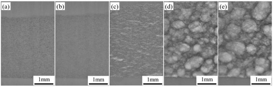 In the ensuing temperature range from E2′ to N, the matrix’s expansion rate experiences another acceleration. During this phase, the matrix possesses a lower liquid-to-solid ratio, imposing limitations on its expansion. This results in the formation of prominent crack-like features within the evolving pore structure, oriented to the rolling direction, as demonstrated in Figure 7c. As the warming process continues, the foaming environment improves due to an increased liquid-to-solid ratio. This improvement leads to enhanced pore sphericity, as shown in Figure 7d. The pore walls undergo creep deformation and rupture due to the ongoing decomposition of titanium hydride with rising temperatures. This prompts pore growth as they merge. These processes collectively contribute to the growth of pore diameter during the stable foaming period, as illustrated in Figure 7d,e.