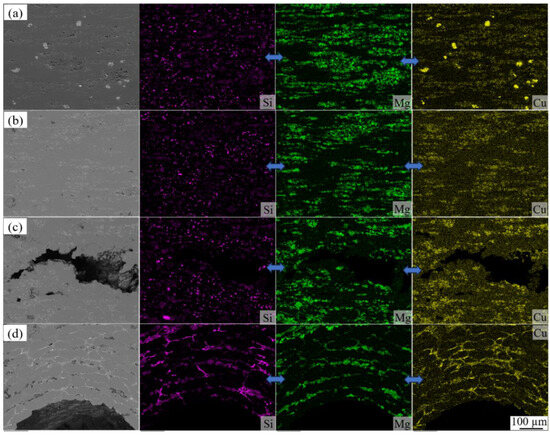 Distribution of Si, Mg, and Cu elements within the matrix corresponding to temperature points (a) P1, (b) P2, (c) P3, and (d) P4 on the curve in Figure 6a.