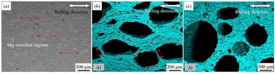 The characteristics of pore structure at different foaming stages are intricately linked to the morphology of the powder distribution. During the precursor heating process, alloying reactions tend to occur preferentially in the enriched areas for multiple elements within the powder. Notably, the contact surfaces involving various elements along the rolling direction possess the most substantial specific surface area, allowing for extensive alloying and resulting in the highest liquid-to-solid phase ratio. This is clearly illustrated in Figure 10a, where a significant amount of white Mg-enriched regions forms along the rolling direction, facilitating the initial nucleation process of cracks. Under the pressure stemming from the decomposition of titanium hydride, pores preferentially aggregate in this region, leading to the development of an oriented distribution of characteristic pore morphology. Conversely, the aluminum matrix tangent to pore boundaries impedes further pore growth and merging at this stage. These insights are evident in Figure 10b. As the temperature progresses to the P5 point, the orientation distribution characteristics of aluminum particles vanish due to the effective diffusion of Si, Mg, and Cu elements into the aluminum matrix. This phenomenon is demonstrated in Figure 10c, where the aluminum matrix surrounded by the second phase exhibits a granular crystal structure after cooling. Moreover, the higher liquid-to-solid ratio alleviates the matrix’s constraint on pore growth. Consequently, pores manifest a more rounded shape at this stage. Overall, these findings highlight the intricate interplay between powder distribution, alloying reactions, and temperature changes, influencing the evolving pore structure throughout the foaming process.