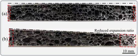 These conclusions gain additional support when examining the boundary morphologies of the specimens. In Figure 13a, the dense aluminum layers (marked in the red dashed boxes) at both ends exhibit similar thicknesses. Conversely, Figure 13b displays a noticeable thickness discrepancy at both ends. Within powder metallurgy foaming processes, thicker, dense aluminum layers at the boundary generally correspond to a greater gas overflow. This observation further strengthens the deduction that the excessive gas spillage at the right boundary of the precursor in Figure 13b contributes to this issue. Importantly, the boundary effect curtails the expansion capacity of the matrix.