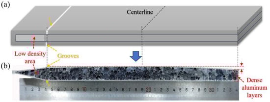 To tackle the plate shaping difficulties arising from boundary effects, a simple engineering approach involves implementing edge-sealing treatment prior to the foaming process. As depicted in Figure 14a, the precursor’s left side remains uncut, utilizing the edge-sealing technique, whereas the right side, as per traditional practice, is trimmed before foaming. In order to counteract the limitations imposed by the left boundary on matrix expansion, precise grooves are intricately carved into both the upper and lower panels within the boundary region. This deliberate design serves to guide controlled bending at this particular juncture during expansion, effectively alleviating the impact of edge-induced constraints on panel shaping. Of paramount importance, the depth of these grooves is intentionally set slightly below the panel thickness, thereby preventing the escape of gases from this area. Figure 14b depicts the cross-section of the foamed AFS. Notably, the left side showcases elevated expansion and improved flatness in comparison to the right side. Even in areas of low-density powder with poor blistering ability, the pore structure exhibits premium properties and minimizes dense aluminum layers. In contrast, on the right boundary powders, the influence of the boundary effect diminishes the expansion capacity, leading to pronounced bending in the plate shape.