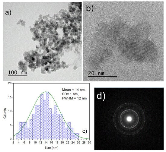 TEM micrographs of the 2AeroNPs-top nanoparticles obtained using the aerosol-based technique (a,b), histogram of the crystallite size distribution (c), and the electron diffraction pattern for the studied NPs (d).