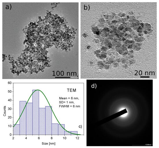 Appropriate adjustment of the processing conditions, as shown in Section 2 for the 2AeroNPs specimen, allowed the fabrication of ultra-small superparamagnetic nanoparticles (USPION), as presented in Figure 3. This was possible by changing the synthesis parameters, further TEA-coating, and the centrifuge separation of the dispersion into two fractions. In the case of the 2AeroNPs-top specimen, the maximum of the distribution is located at ∼5–6 nm. The NPs in this fraction were not larger than 11 nm and were far smaller than those obtained using the standard co-precipitation technique. The full width at half maximum (FWHM) of its distribution reached 3.5 nm, proving the effectiveness of this process. The TEM images taken for both 2AeroNPs-top and 2AeroNPs-bottom specimens (Figure 3a,b and Figure 4a,b) have shown the formation of agglomerates of magnetite NPs. However, their sizes are different depending on the fraction of the nanoparticles. In particular, the TEM images of the 2AeroNPs-bottom have shown the presence of larger agglomerates (up to ∼300 nm) constituting this specimen (Figure 4a). This might be caused by the fact that this particular dispersion is obtained as a partly sedimented fraction after centrifugation. In addition, the particle size distribution is wider and its FWHM reaches 6 nm (Figure 4c), though the maximum of the distribution corresponds to ∼5–6 nm (as in the case of the 2AeroNPs-top specimen). The electron diffractions for both specimens (the 2AeroNPs-top, Figure 3, and 2AeroNP-bottom, Figure 4d) form uniform rings characteristic of the homogeneous and very small nanoparticles.