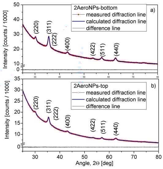 XRD scans for the 2AeroNPs-bottom (a) and 2AeroNPs-top (b) specimens, together with the Rietveld refinement lines.