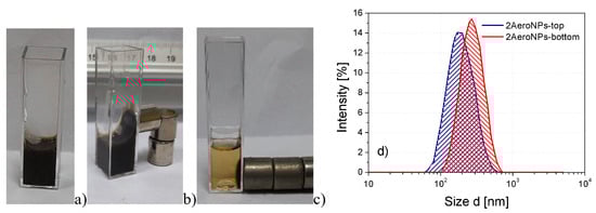 The 2AeroNPs-top dispersion of magnetite nanoparticles stabilized by TEA-oleate (a), the sample attracted by a magnet for 1 min (b) and 24 h (c), and the DLS hydrodynamic sizes for 2AeroNPs-top and 2AeroNPs-bottom specimens (d).