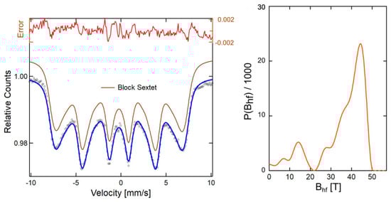 Room temperature Mössbauer spectrum measured for the 1AeroNPs sample (black circles), together with the hyperfine field distribution (light red line) corresponding to the fitting block sextet line (brown). The error line (dark red) represents a difference between the fitting line and the measurement points. Blue line-the complete fit.