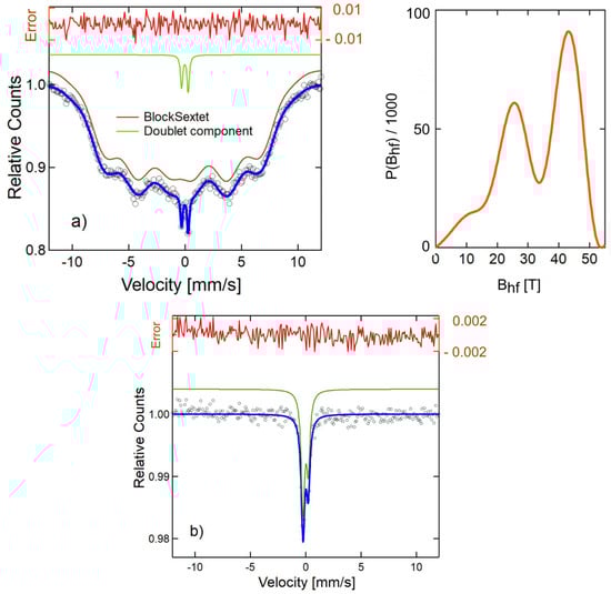 In the case of 1AeroNPs (Figure 8), a wide Mössbauer sextet line was measured. In this case, it was possible to fit the experimental spectrum using a block sextet line corresponding to the hyperfine field distribution, as also presented in Figure 8. The shape of the Mössbauer spectrum suggests the existence of some interactions between the superparamagnetic NPs forming large agglomerates and thus revealing ferrimagnetic behavior. This effect is also partly visible in the case of the 2AeroNPs-bottom sample. Here, except for a very wide sextet line, an additional doublet component corresponding to the presence of separated superparamagnetic NPs was observed (Figure 9a). As was shown in [3], collective interaction between magnetic nanoparticles in their agglomerates causes an increase in the fluctuation time of the magnetic moment. This effect has its feedback in the shapes of the Mössbauer spectra. The superparamagnetic state of NPs is more pronounced in the case of the 2AeroNP-top sample (Figure 9b), where its Mössbauer spectrum was well fitted using a single doublet line.