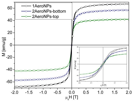 The magnetic properties of the specimens were measured using a LakeShore 7307 VSM magnetometer (Lake Shore Cryotronics, Inc., Westerville, OH, USA), operating at room temperature in magnetic fields up to 2 T. The studied dispersions were dried in a vacuum oven at 60 °C for 24 h. As the 1AeroNPs sample was initially a water dispersion of nanoparticles (without further coating with TEA-oleate), consequently the powder specimen was obtained. On the other hand, drying of the 2AeroNPs-top and 2AeroNPs-bottom specimens resulted only in the removal of the water, while TEA-oleate remained on the surface of the NPs. Then each specimen was immobilized in the VSM holder for magnetic measurements.