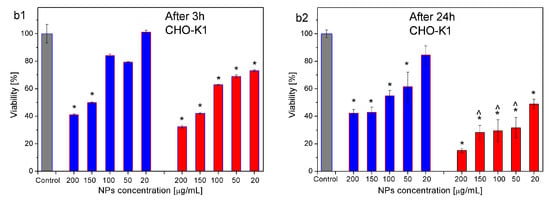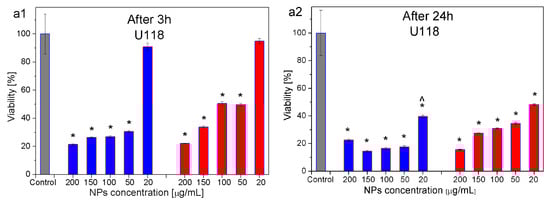 Viability of U118 glioblastoma cancer cells (a1,a2) and CHO-K1 normal cells (b1,b2) cultured for 3 h (a1,b1) and 24 h (a2,b2) with the addition of 2AeroNPs-bottom (blue bars) and 2AeroNPs-top (red bars) nanoparticles of different concentrations. Here, (*) 0.05 vs. control sample (black bar), (∧) 0.05 vs. the same sample but after 24 h.