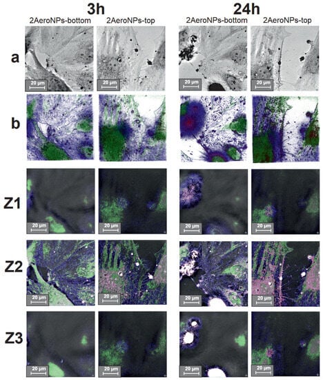 Holotomographic images of CHO-K1 cells cultured with the 2AeroNPs-top and 2AeroNPs-bottom dispersions with a concentration of 20 g/mL (a); 3D images reconstructed from RI differences between NPs (red), nucleus and cytoplasm (green), and cell membrane (blue) (b); Z1, Z2, and Z3: holotomography images of the respective layers. Images were taken after 3 h and 24 h with a scale of 20 m.